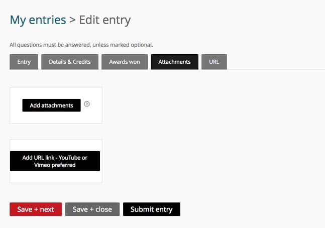 Step 5 – Add campaign/single attachments and any case study or commercial here. For print Ads/Campaigns click “Add Attachments” and upload file with the entry title. For multiple entries in the campaign click “Add Attachments” to upload the 2nd, 3rd, 4th etc etc ad in the campaign with each entry title. If you are entering a Film category or a category that is using a case study video then click “Add Attachments” to upload a key still from the Film or Case Study video then click on “Add URL Link” and upload the URL link to the Film or Case Study (YouTube or Vimeo links preferred). If you are entering a campaign then upload a key still; different title and a different YouTube or Vimeo link for each part of the campaign.